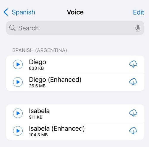 4) For better voices you will need to download them from Settings - Accessibility - Read & Speak - Voices - language - download the enhanced/premium versions for the better ones, remember that the bigger sizes usually indicate better voices!